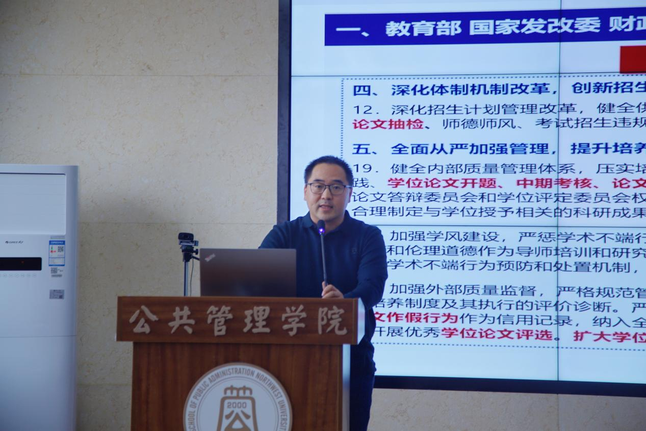 冯建涛作了题为《新时代研究生教育的新要求与若干工作》的报告,从加强内部质量管理体系、强化导师岗位管理、加强学风建设、完善质量评价机制、强化论文质量管理以及专业学位培养质量专项巡查、学位点专项合格评估注意事项等角度指明了研究生培养质量提升的重点举措。