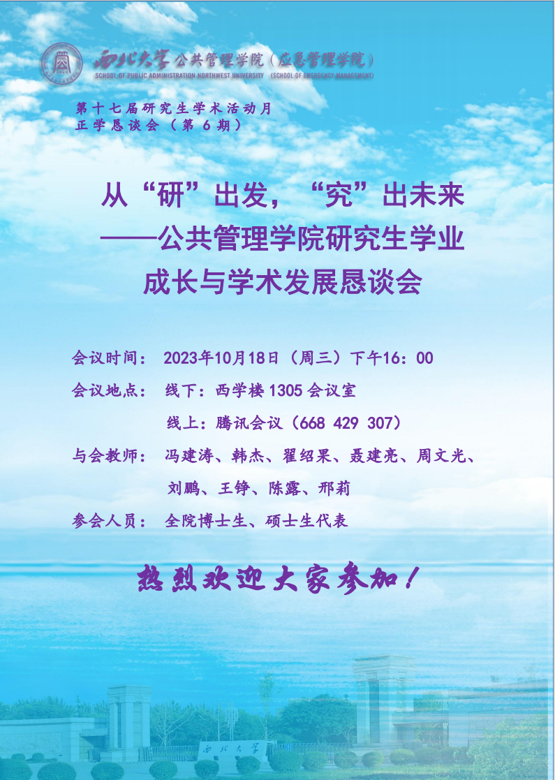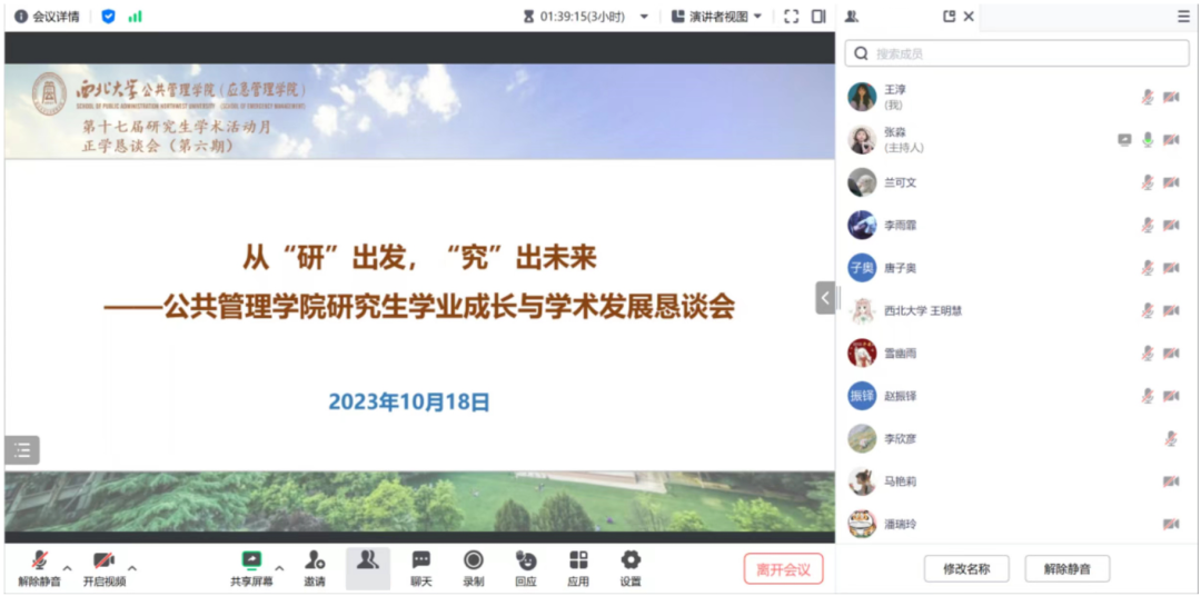 为进一步完善我院研究生教育、教学以及管理工作,促进教师充分了解学生在学术与生活中遇到的问题、想法、意见,并针对学生问题给予相关建议,搭建学生与学校、学生与学院沟通交流的桥梁。2023年10月18日,565net必赢2023至2024学年正学恳谈会(研究生专场)于西学楼1305会议室召开,腾讯会议同步进行线上会议。本次会议以“从‘研’出发,‘究’出未来”为题,校研究生院副院长冯建涛、我院党委副书记韩杰、科研副院长翟绍果、社会保障学系副主任聂建亮、公共政策与管理系主任周文光、人力资源管理系主任刘鹏、公共信息资源管理系主任王铮、学院团委书记陈露、研究生秘书邢莉以及全院博士、硕士研究生参与本次会议,会议由翟绍果教授主持。
