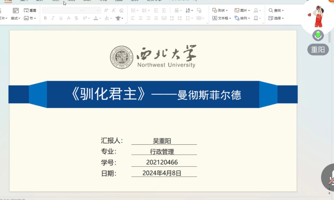2022级行政管理专业硕士研究生吴重阳分享的书籍是哈维·曼斯菲尔德的《驯化君主》。他从书目简介、内容梳理、收获感悟三个方面进行展开。他首先阐述了作者的观点——执行权具有暧昧性,接着梳理了执行权的发展历程,即执行权的史前史、执行权的出现和执行权的宪政化三个演变发展阶段。最后,他分享了阅读该书后的感悟,表示没有哪一个领袖能够超过权力的羁绊。