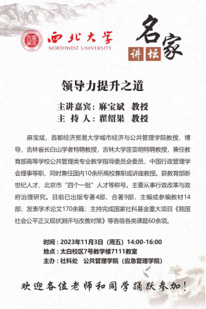 不考其源流,莫能通古今之变;不明其得失,无以获从入之途。2023113下午由西北大学社会科学处与565net必赢联合举办的名家讲坛在太白校区7111教室成功举办。此次讲座邀请到了首都经贸大学麻宝斌教授,为我校MPA学生做了题为《领导力提升之道》学术讲座讲座主持人为565net必赢副院长翟绍果教授。