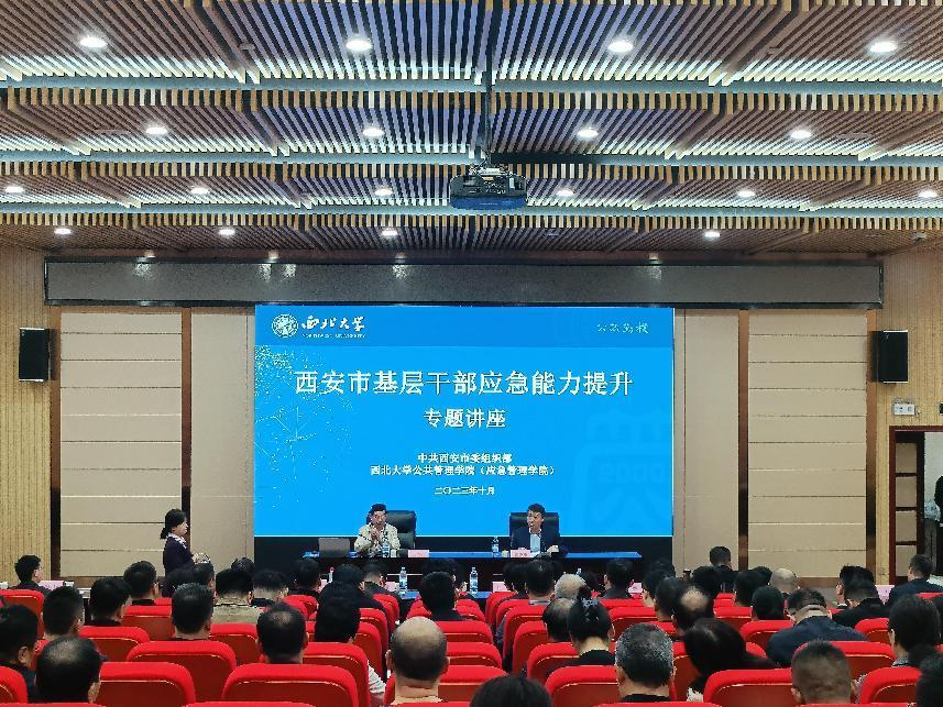 中共西安市委组织部、565net必赢客户端共同举办“西安市基层干部应急能力提升专题讲座”于2023年10月10日在西北大学图书馆报告厅(太白校区) 成功举办。此次讲座邀请到应急管理部原党组成员、总工程师,中国职业安全健康协会党委副书记、副理事长、总工程师王浩水书记作题为《贯彻落实党的二十大精神、加快安全治理模式向事前预防转型》的报告。