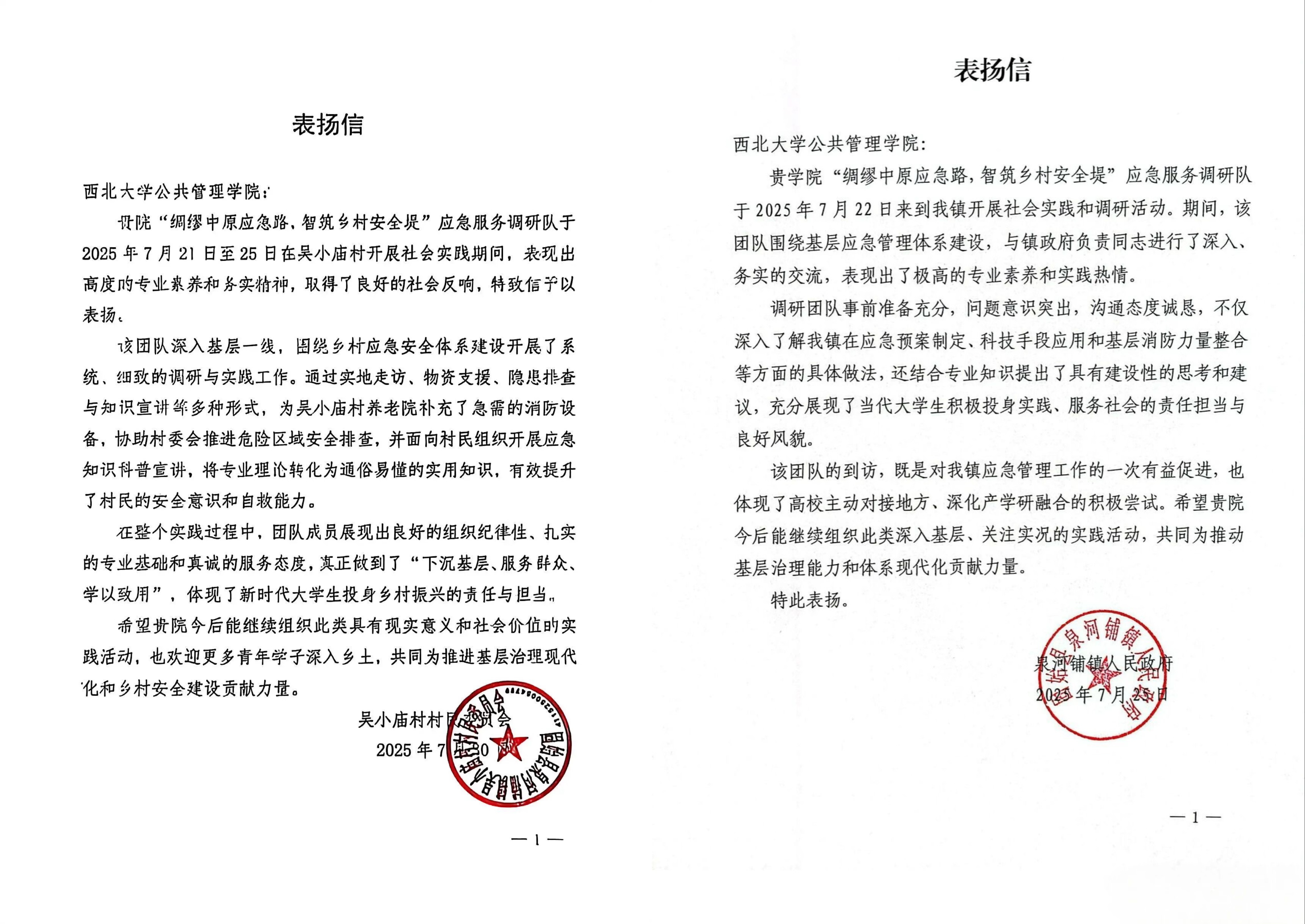 近日,565net必赢客户端先后收到来自河南省泉河铺镇人民政府与吴小庙村村委会的表扬信,对我院“绸缪中原应急路,智筑乡村安全堤”应急服务调研队在2025年暑期社会实践活动中的出色表现予以高度肯定和表扬。两封表扬信均指出,调研团队事前准备充分、组织纪律严明、沟通态度诚恳,真正做到了“下沉基层、服务群众、学以致用”,体现了新时代大学生服务国家、服务人民的社会责任感和专业使命感。